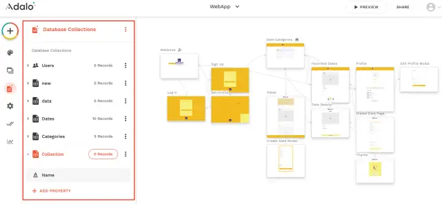 في Adalo ، سيكون لديك القدرة على إنشاء مجموعات - تناظرية لقاعدة بيانات. داخل كل مجموعة ، يمكنك إضافة خصائص مختلفة. النظام الأساسي يعمل فقط مع الأنواع الرئيسية للحقول: نص ، رقم ، منطقي ، التاريخ والوقت ، التاريخ ، الصورة ، الملف.