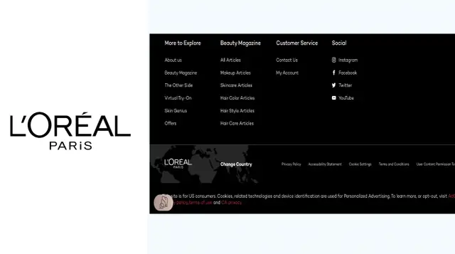 Their footer is bold, with white typography set against a black background. The footer text creates an interactive experience for users as it changes color from white to red when mouse over. As a prominent beauty brand, the social pages of the site are displayed by site icons to the right of the footer.