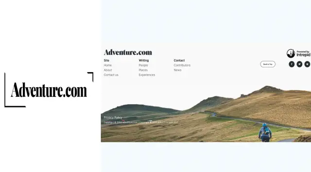 The layout of their website footer is very attractive to nature and travel enthusiasts. The text is bold and playful, and the backdrop contains a large image consistent with the site theme of adventure. Its social media icons are boldly displayed and are convenient for users who wish to post adventure content to the adventure.com social media pages.