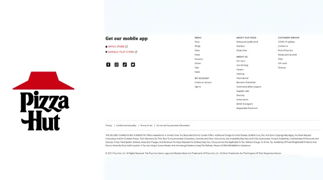 The footer layout includes the store location, which is useful for helping users locate the nearest physical outlet. It also includes a blog and social media links in the layout. The footer also includes navigation links to their most popular menu items and nutritional information.