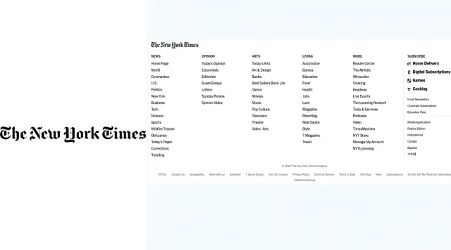 This website footer layout divides the various content blocks on the website into news, opinions, arts, and living. This facilitates easy navigation to the desired topics. They also include their privacy terms, disclaimers, copyright, and other legal policies in the fine print of the footer. Prominently displayed in their footer layout are their digital subscription products, games, cooking, and other monetized resources.