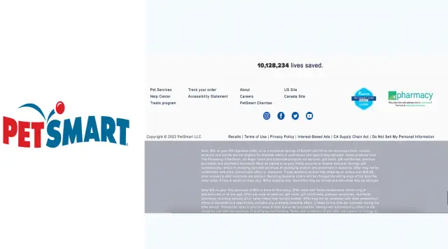 Their footer design is attractive, right, and playful. It features an image of a pet, links to its charities, and a real-time counter of the number of animals impacted by their foundation. The footer design also includes a prompt for persons who wish to donate and sign up, to receive promotional incentives.