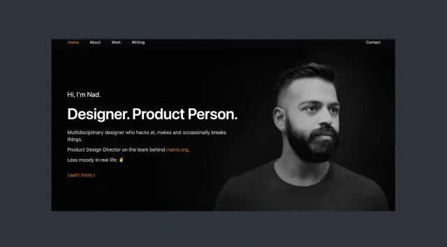 We wanted to include this example to show you how you can include your brand/company/business mission on your portfolio homepage. A business mission is a sentence or a small paragraph that states your goals as a professional and what you can offer to your customers. On Nad Chishtie's homepage, we read, "I build value through design." If you have a short and effective mission statement, you can include it in your portfolio.