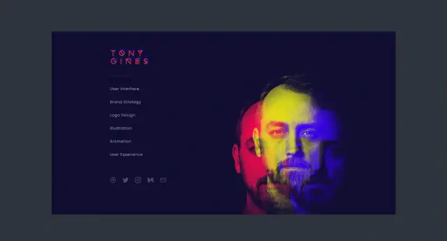 This is an example of minimalist web design. You can check Tony Gines' portfolio if you need some inspiration in this field. Its homepage has few elements, and the navigation menu only includes six voices.