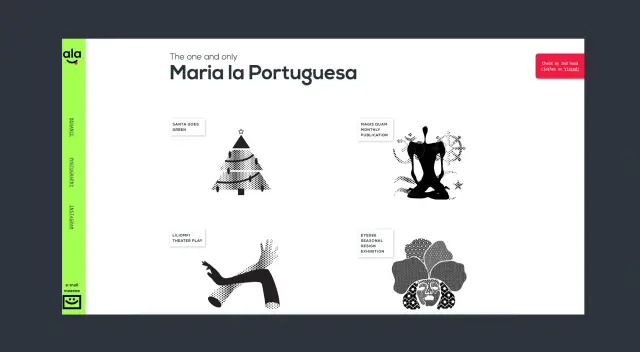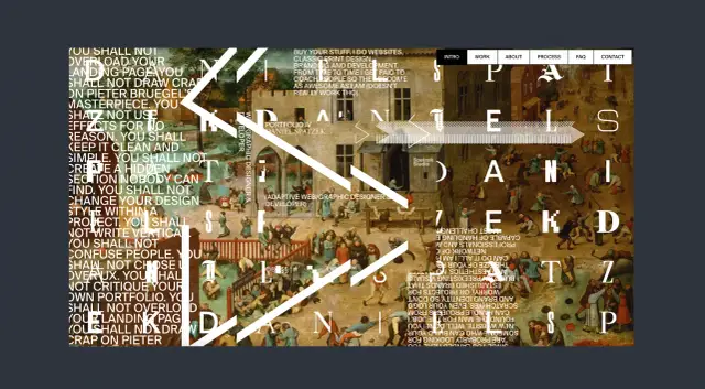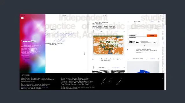 One of the unique portfolio sites we can find is Adam Ho's, a web designer active in New York with years and years of experience. At first glance, this portfolio site (an entire website) can look quite busy: your eyes don't know where to land. If this wasn't this unique, this "chaos" would be a disadvantage, so follow this inspiration only if you have a clear vision and are very experienced. This is an interactive portfolio site; different projects appear on the page, and you can click and explore each of them. However, the web designer's unique design style makes this portfolio and project so unique.