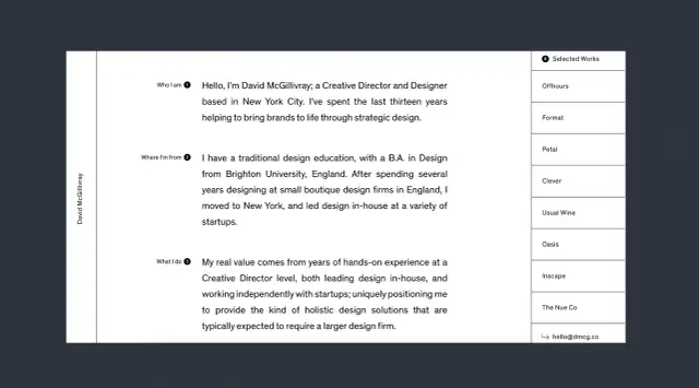 This is a web designer with a lot of experience, and he has a good reputation. This isn't maybe an example suitable for beginners, but experienced web designers could steal some ideas. David McGillivray's portfolio is text-based: you display a page where he explains who he is and what his experiences are, and then there is a list or a menu that the user can click to visualize his projects by one. Why is it suitable for complete beginners? Because as a beginner, you want to show first and then tell. Experienced web designers can, instead, talk about themselves and their unique vision and then show what they are capable of.