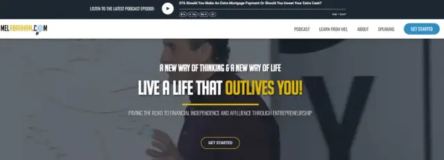 Mel Abraham is a well-known entrepreneur, author, and trainer, which his website perfectly captures. His seminars are always filled with many audience members who follow Abraham's work. Mel Abraham's way of speaking and confidence is an integral part of his personal branding. Mel's website uses a modern color palette of yellow and white with some black highlights. The homepage includes his work, a link to his training, and videos from his YouTube channel. At the top of the site, you can see a window with the latest podcast and play it on the site.