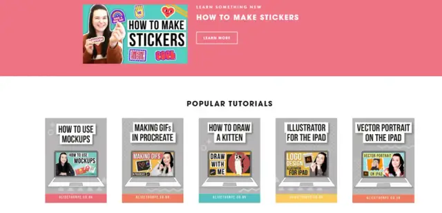 Alice Thorpe is a graphic designer and YouTuber. Her YouTube channel is not only the place to learn graphic designing but her humor and jolly personality keep her viewers engaged, incorporating her brand. Like Thorpe's YouTube channel, her website is filled with creativity and colors. That is what her branding represents, as mentioned in her YouTube bio "Stumbling through life one pixel at a time." Moreover, her website shows her popular tutorials, which is very convenient.