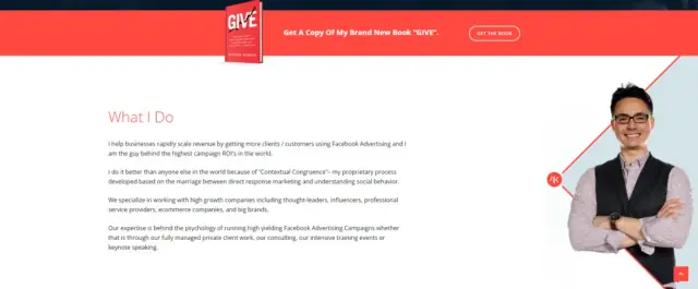 Nicholas is quite famous in the tech industry, especially in digital marketing. He is a trainer, author, and Facebook Ads Guru. His website's homepage features clients' testimonials, a link to his free, paid training, and some videos and pictures of him sporting a wide smile. All of this cumulates into Nicholas's personal brand, a smiling personality with a successful track record in digital marketing.