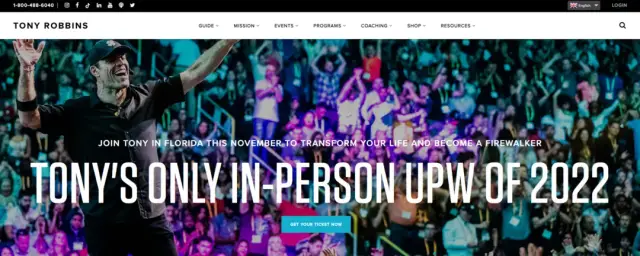 Tony Robbins is a controversial yet famous personality. His written books, seminars, podcasts, and other mediums all revolve around his personal brand of self-financing. He is one of the well-known faces, and people listen to him for his charisma and non-stop energy. Tony Robbins' site is a good example of the right personal branding. The site's homepage is pretty simple with a dark tone and highlights all the offerings Tony Robbins provides. Also, there is a big photo of him and his audience - it's a great illustration of how popular he is.