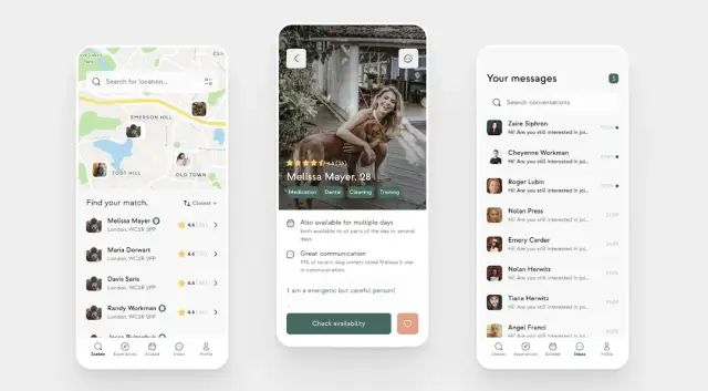 Each candidate can have their profile, a brief description of the experience, an indication of the cost and residence, the ability to switch between "busy" and "active job search" modes, and search and see the latest open requests for walking. The application user turns on the geolocation on the phone, enters the walking hours, and receives a list of free candidates. He can find himself a permanent walker and a new one each time. The app can also make payments for secure withdrawals and reserve funds.