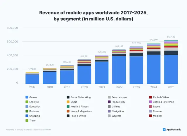According to a study by Statista Research Department, the revenue generated by mobile apps is expected to increase to a massive $613 billion by 2025. The following graph shows the result of the study: