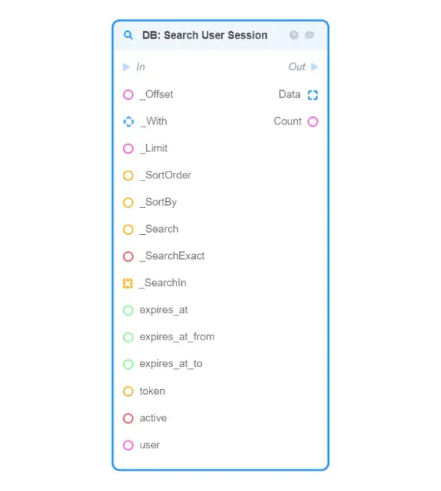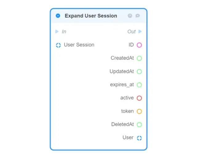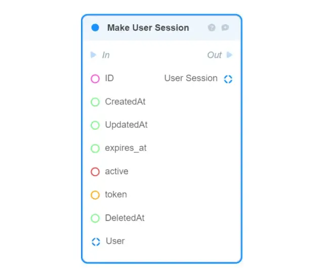 Make User Session — creates a new User Session object in memory from the given fields and returns it (to save the created object in the database, use the DB: Create User Session block);