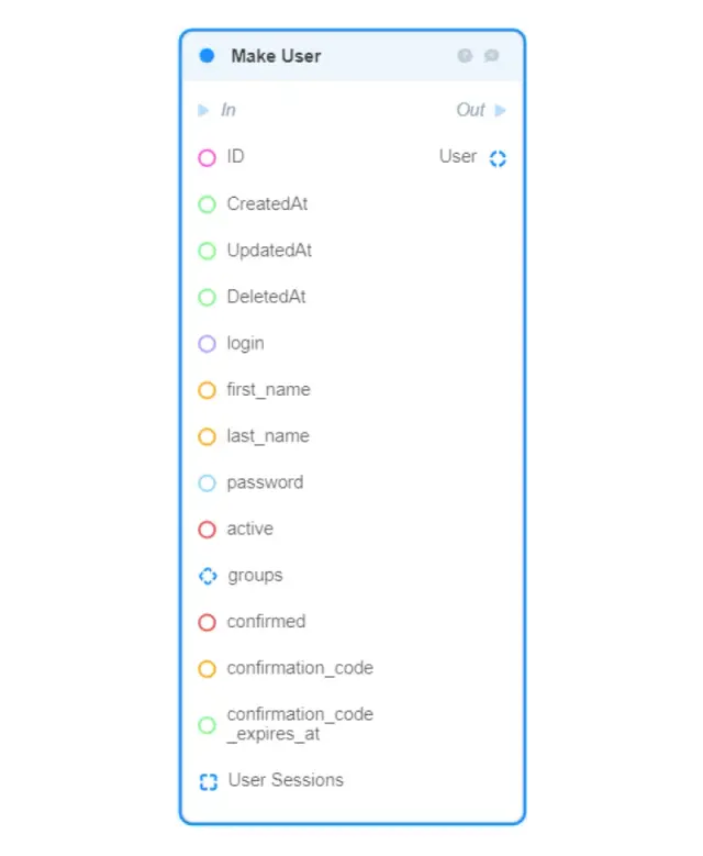 Make User — creates a new User object in memory from the given fields and returns it (to save the created object in the database, use the DB: Create User block);