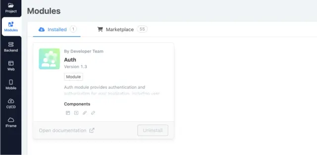 Registration in the assembled application on our platform is represented by the Auth module, allowing you to create and edit user groups and access their rights. The Auth module is already preinstalled into the project when it is created.