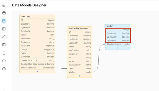 All database models are represented as blocks. They can be freely moved around the workspace and arranged in the desired order. You can also add custom fields to each model. When creating a new field, you need to enter its name and description and specify additional settings.