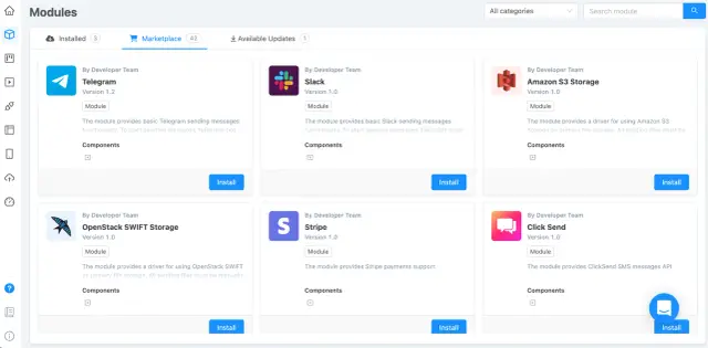 The list of modules grows with the platform's development, but their main advantage is that each of them can be added in just one click.