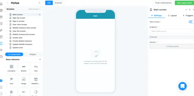 There are lists of screens, UI components, and widgets on the left part that can be moved and added to the desired screen. On the right, you will find the settings for the selected item.