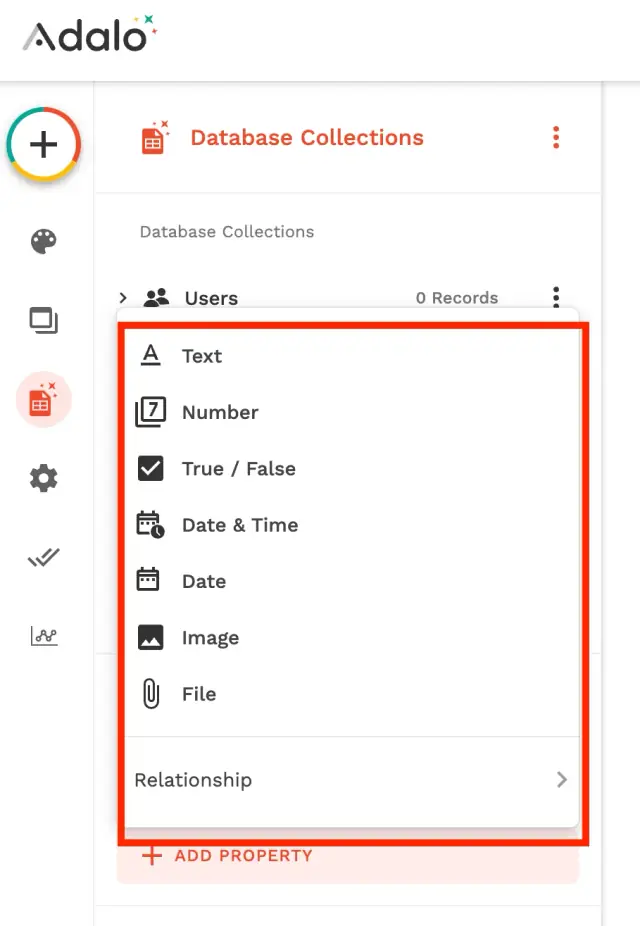 In Adalo, you will have the ability to create Collections — an analog of a database. Within each collection, you can add different properties. The platform only works with the main types of fields: text, number, boolean, date & time, date, image, file.
