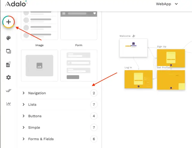 All available elements for working with logic are located in the Screens tab. You create a blank screen and add the necessary elements: buttons, icons, lists, images. All components are divided into groups for convenience: Navigations, Lists, Buttons, Simple, Forms & Fields.