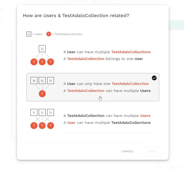 You can configure relationships between properties. In Adalo, these are standard database relationships: one-to-one, one-to-many, many-to-many.