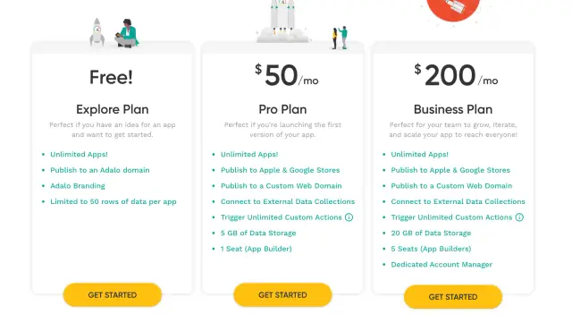 Adalo has three subscription plans. The first option is free and is mainly used to explore and test the product. It has limitations of 50 lines of data per application and the ability to use only the Adalo subdomain for deployment. The other two plans cost $50 and $200 per month. Features and functionality expand as the plan changes, but the free package is unlikely to be enough to create a good product. But you can test the tool and decide if it suits you.