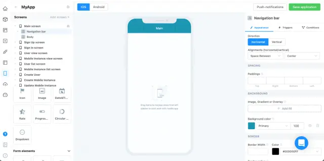 To place the desired element and component in Adalo, you can drag and drop them to the desired location. There is a convenient navigation panel in the left part of the window where most of the settings are located. By selecting an element, you access its parameters for more detailed customization of the visual and functional parts.