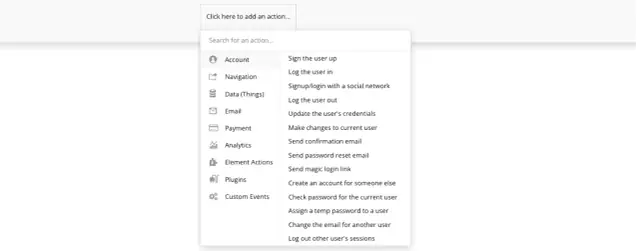 To work with application logic,Bubble has a Workflow section. To start the process, you must select an event, which in the scheme is denoted by the When keyword (for example, "When User is logged in"). Next, you need to add an action for this event. The number of actions can be unlimited.