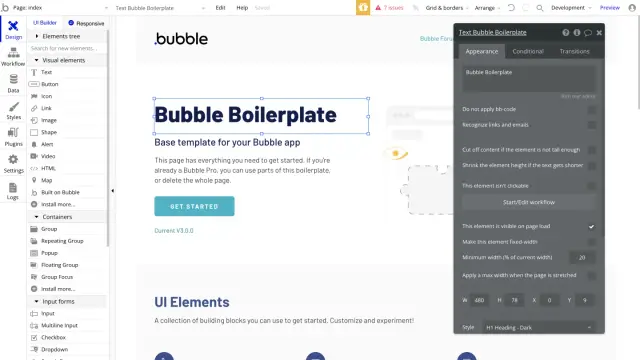 Bubble works on drag & drop technology. The Design tab in the left panel contains all the components you can drag onto the application page. When you click on an element, a setup window for this element appears, where you can configure the display settings and other parameters. The position of the components is set manually or through coordinates.