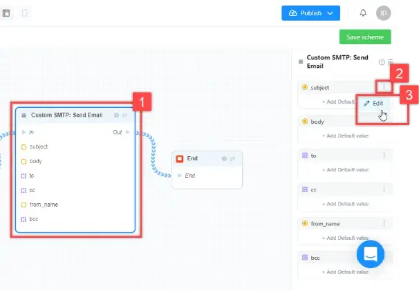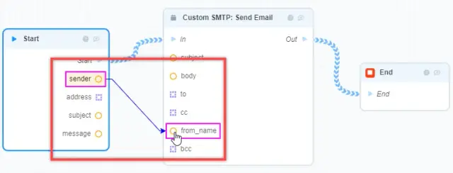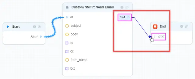 2. Similarly, create a link between the "Out" field of the "Custom SMTP: Send Email" block and the "End" field of the "End" block
