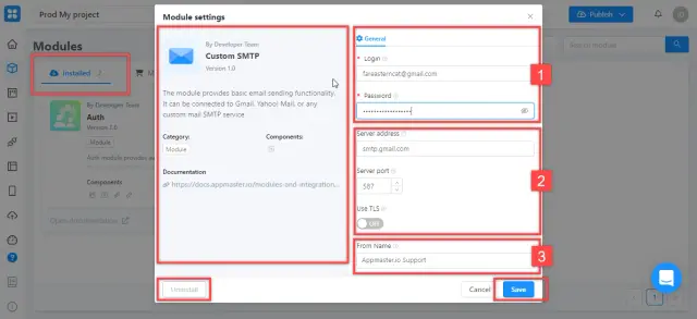 Go to the "Installed" tab, where all the modules installed in your application are located, and click on the "Custom SMTP" box to open its settings. Basic information about the module and a button to remove it from the application are displayed on the left. On the right are the fields that you need to fill in: