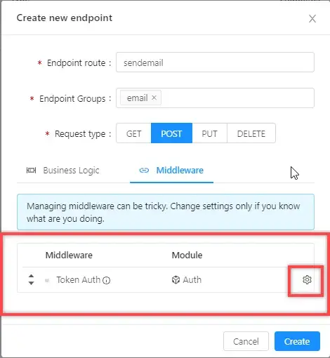On the “Middleware” tab, you need to configure the rights to perform actions with this endpoint (and, therefore, to launch the associated business process). In other words, you will specify who can send emails from your application. To do this, you need to change the setting of the "Token Auth" authorization token.