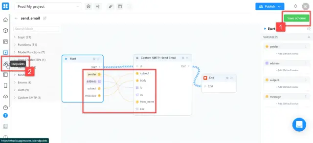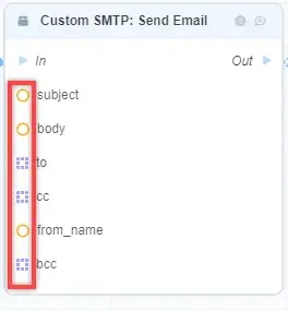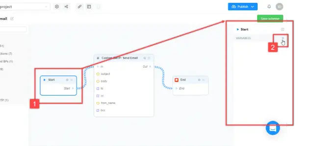 1. Move the mouse pointer over the "Start" field in the "Start" block, hold down the left mouse button, and swipe to the "In" field in the "Custom SMTP: Send Email" block - a connection is formed between the blocks.