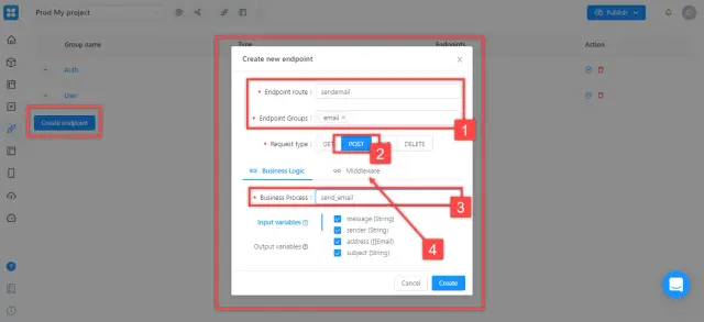 Click "Create endpoint" - you will find yourself in the settings on the "Business Logic" tab, here you need to specify the following settings: