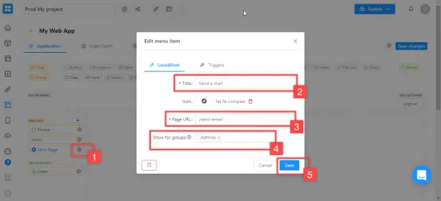 Go to the editor and create a new page from which you will post. Indicate the name of your page ("Title"), its address ("Page URL"), and groups of users who can send messages ("Show for groups"). Click “Save”.