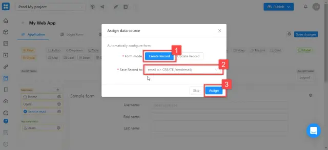 In the opened window, click "Create record", the list of available endpoints will be displayed in the "Save Record to" field - select the one that you just created. Click "Assign".