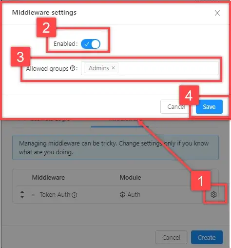 Click on the gear icon next to “Token Auth”. In the opened window, turn on the selector, in the "Allowed groups" field, select the "Admins" group (or any other that you want to give access to). Click "Save"