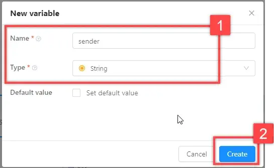 In the opened window, enter the name of the variable: name "sender", type "String". Click "Create".