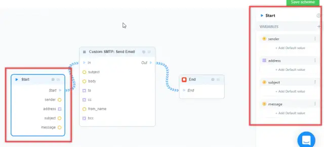 Similarly add "address", "subject" and "message". Now the list of variables in the "Start" block looks like this: