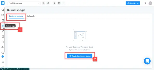 Go to the "Business logic" tab and click on the button to create a new business process.