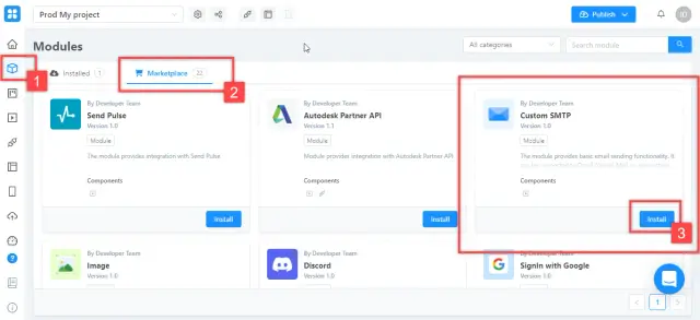 Find the Custom SMTP module in the Marketplace tab and click the Install button to add it to the application.
