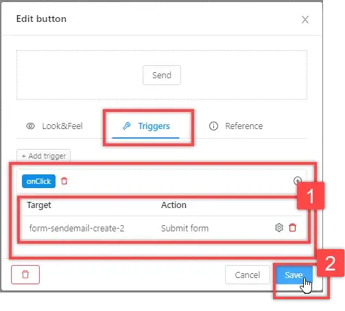 On the "Triggers" tab, add an action to the onClick trigger: in the "Target" field, select your form, in the "Action" field, select "Submit form". Click “Save”.