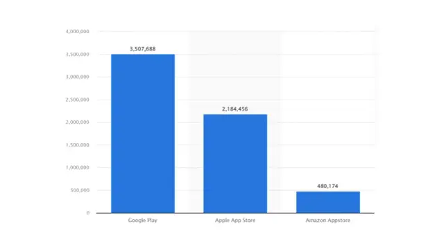The number of mobile apps available on app stores like Google Play Store, Apple App Store, and Amazon Appstore has exponentially grown to over 6 million, as shown in the following graph: