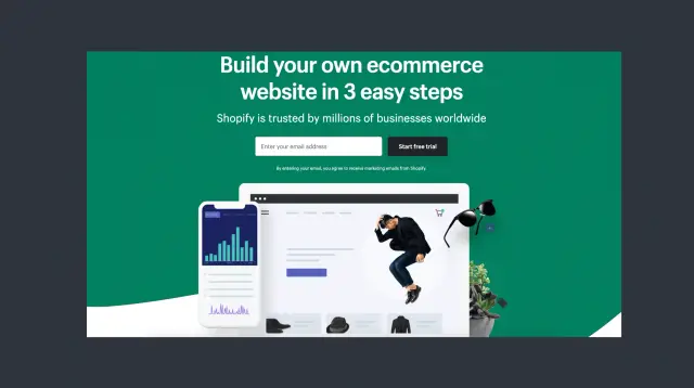 This site may be seen on the landing page for Shopify's free trial. Simple headings and calls to action, like "Start a free trial," are provided. Each component on the page takes the visitor on the same journey designed to turn them into qualified leads. They demonstrate the layout of one of their shopping sites while using current, fashionable photos and adding a hint of 3D with the sunglasses in the corner.