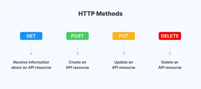 GET: retrives a resource identified by the URI from the server.POST: creates a new resource on the server using the data provided in the message body.PUT: updates an existing resource with the data provided in the message body.DELETE: deletes the resource identified by the URI from the server.