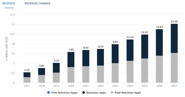 The diet and nutrition app market has seen exponential growth in recent years, driven by consumers' increasing focus on health and wellness. According to a recent study by Statista the nutrition apps segment's revenue is expected to reach $4.96 billion in 2023. The market volume is projected to grow at a CAGR of 11.28% from 2023 to 2027, reaching $7.60 billion by 2027. The user penetration rate will be 4.22% in 2023 and is estimated to reach 4.96% by 2027. The ARPU is forecasted to be $15.29. India will generate the highest revenue globally in 2023, with $1.236 billion.