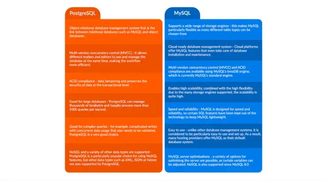 PostgreSQL is slightly more complicated than MySQL, and you might need a little bit more technical information to use it. Since PostgreSQL is an object-relational database, it bridges the gap between relational programming and object-oriented coding. This enables the definition of objects as well as table inheritance, leading to the creation of more intricate database systems.