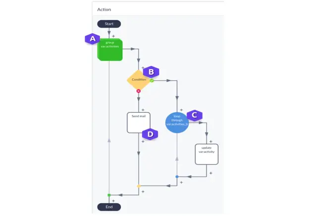 Im Editor werden diese Funktionen als Ereignisse definiert. Eine Aktion besteht aus einer Start- und einer Endmarkierung mit einer Reihe von Ereignissen dazwischen. Die Reihenfolge, in der die Ereignisse angewendet werden, entspricht dem logischen Ablauf des Workflows. Jedes Ereignis hat einen bestimmten Zweck, von denen einige den Verlauf der Aktion beeinflussen...