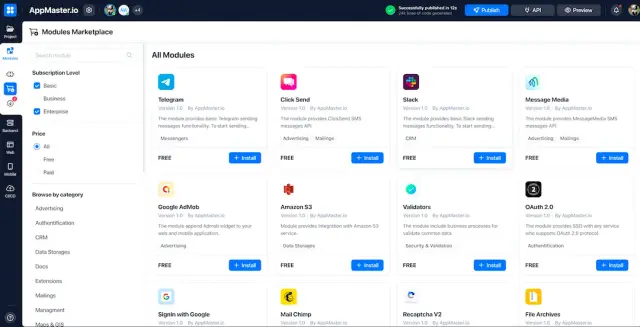 Utilizando AppMaster como no-code plataforma, puede suscribirse a un paquete de alojamiento para escalar cualquier proceso empresarial e integrarlo con otros recursos compartidos. Puede empezar con el plan básico y actualizarlo al cabo de cierto tiempo para ofrecer más funciones específicas para el cliente en AWS.