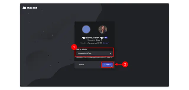 7. Collez le lien copié dans la barre d'adresse de votre navigateur et suivez-le - la fenêtre de votre application s'ouvrira. Sélectionnez votre serveur dans la liste déroulante (1) et cliquez sur Continuer (2).